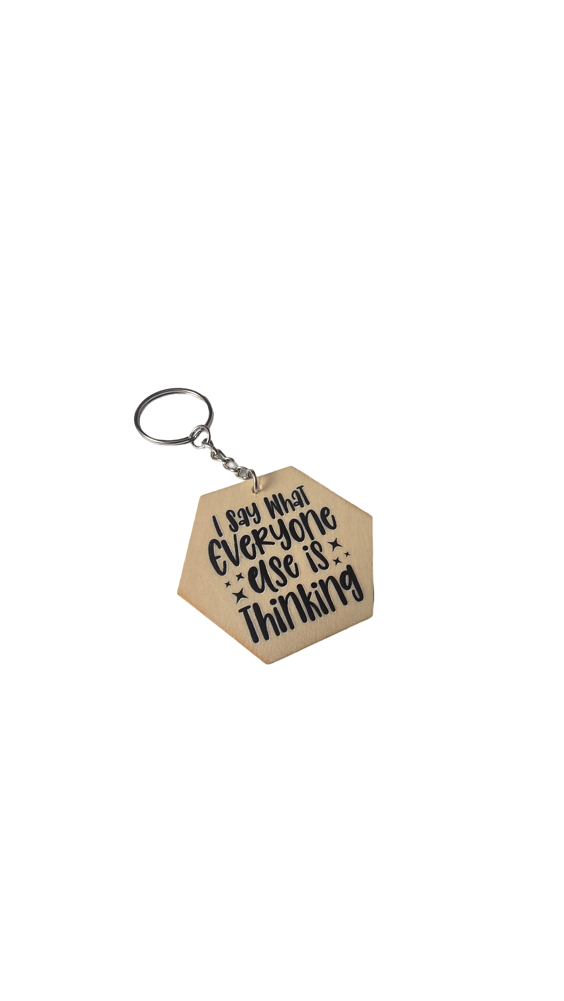 This stylish wooden hexagonal keychain is perfect for everyday use. Featuring the bold phrase, "I say what everyone's thinking," it adds personality and charm to your essentials. Crafted with a smooth lacquer finish and attached to a sturdy metal ring, it’s ideal for keeping keys organized or accessorizing bags. A practical yet unique gift for anyone who loves standing out!
