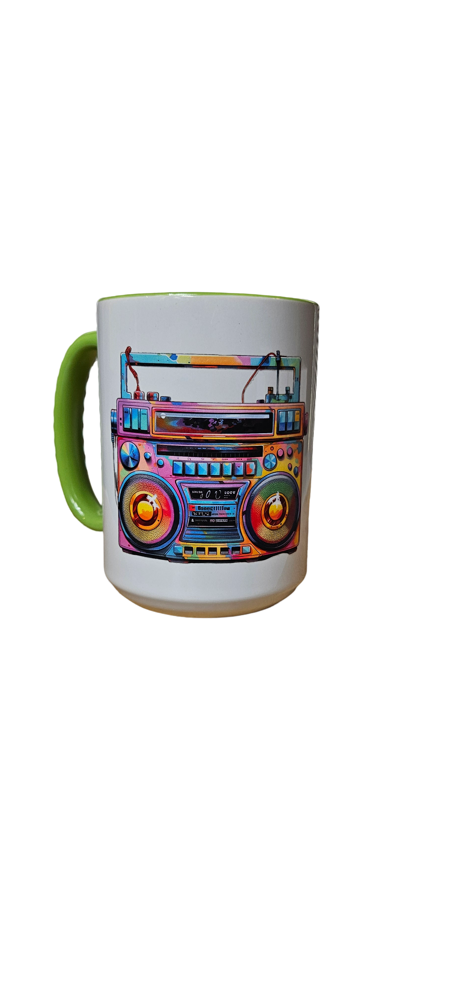 The contrasting green handle and interior add a pop of color that makes this mug stand out in any collection. Whether you're sipping coffee, tea, or your favorite beverage. It's the perfect gift for anyone who loves the golden age of cassette tapes and portable music players, or simply as a fun treat for yourself.